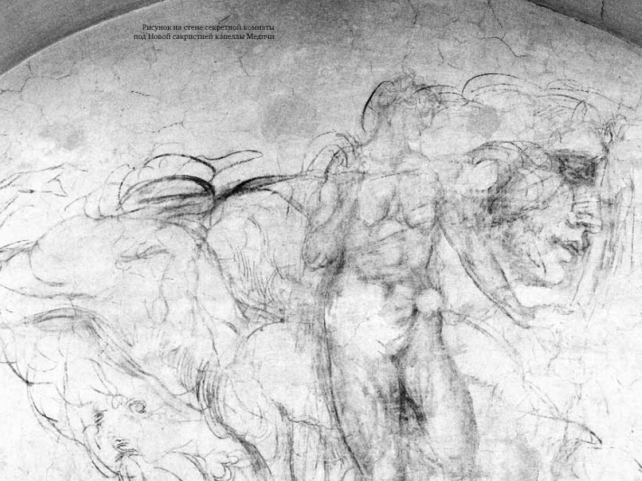 In 1976, a concealed corridor was discovered under the New Sacristy. That corridor might have been some kind of a secret abode where the sculptor extraordinaire and architect of the New Sacristy could rest and relax. There, in complete solitude, he could think, draw and enjoy a quiet atmosphere. But in 1530 he was hiding there, at every minute expecting to be found and killed by the soldiers of Alessandro Medici. Michelangelo, aged 55, was then very ill. He probably felt that the sculptures of the New Sacristy were the last in his creative career. His self-portrait on the wall of the concealed corridor reflects this fear of death (through violence or from an illness). This drawing is critically important for realizing the entire atmosphere in which he had been working in the last three years of the New Sacristy completion.